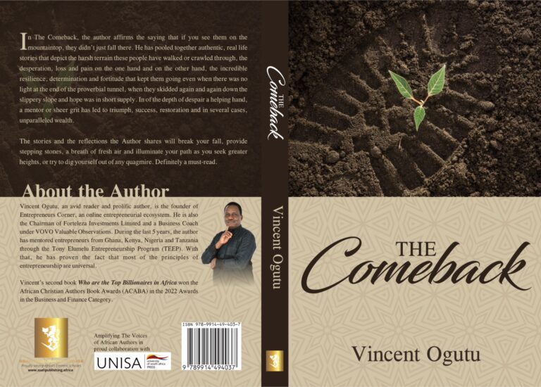 In The Comeback, the author affirms the saying that if you see them on the mountaintop, they didn’t just fall there. He has pooled together authentic, real life stories that depict the harsh terrain these people have walked or crawled through, the desperation, loss and pain on the one hand and on the other hand, the incredible resilience, determination and fortitude that kept them going even when there was no light at the end of the proverbial tunnel, when they skidded again and again down the slippery slope and hope was in short supply. In the depth of despair a helping hand, a mentor or sheer grit has led to triumph, success, restoration and in several cases, unparalleled wealth.